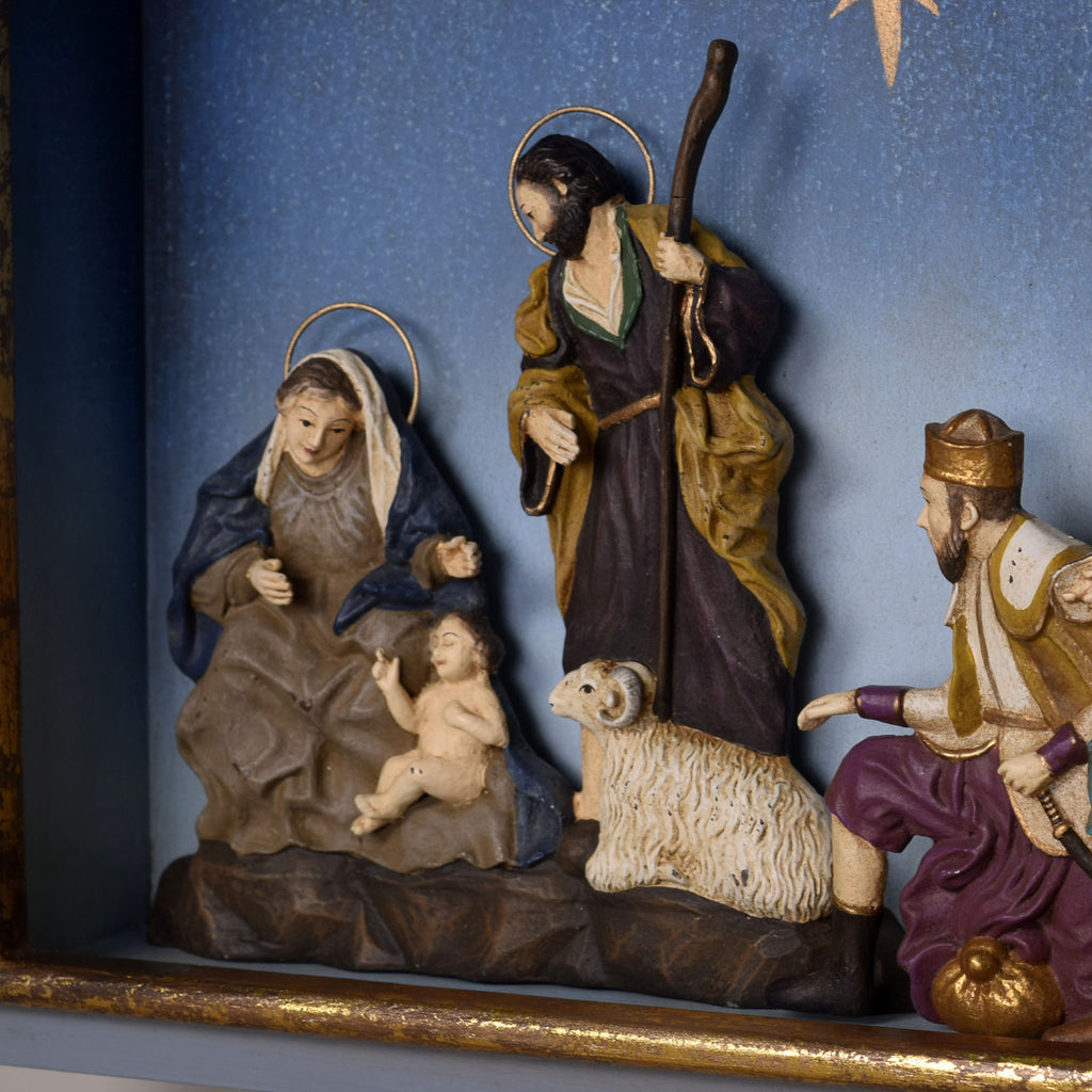 FRAMED AQUALONIA NATIVITY - 16"L x 3.50"W x 12.50"H / Blue Gold Multi Colors / Hand cast resin with wood accents is backordered and will ship as soon as it is back in stock.